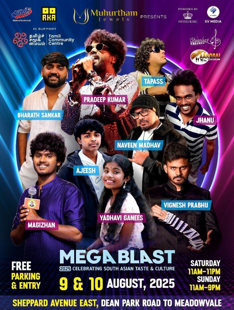 டொராண்டோ, ஸ்கார்பரோ: இந்த ஆண்டின் மிகப்பெரிய தென் ஆசிய கலாச்சார விழாக்களில் ஒன்றான “MEGA BLAST – தென் ஆசிய சுவை மற்றும் கலாச்சார வீதி திருவிழா”, 2025 ஆகஸ்ட் 9 (சனிக்கிழமை) மற்றும் ஆகஸ்ட் 10 (ஞாயிற்றுக்கிழமை) ஆகிய இரண்டு நாட்களில் நடைபெறவுள்ளது.