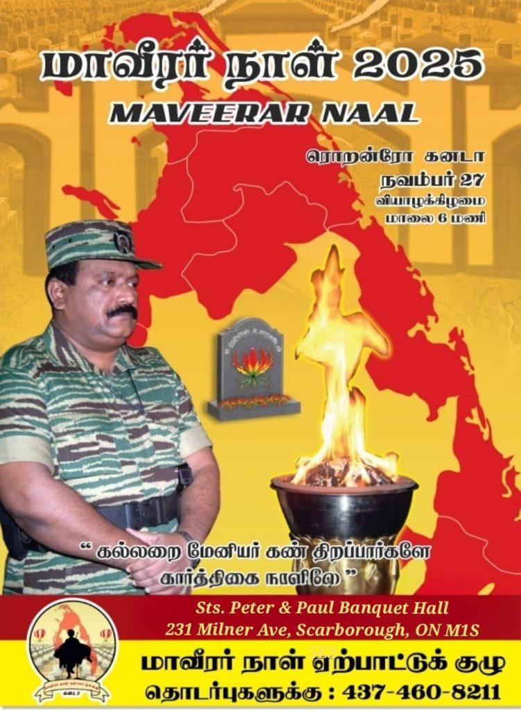 மார்க்கம் and 401 சந்திப்பிற்கு அருகாமையில் 231 Milner avenue ல் அமைந்துள்ள Sts. Peter & Paul Banquet Hall இல் நவம்பர் 27 அன்று மாலை ஆறு மணி தொடக்கம் 9 மணி வரை தேச விடுதலைக்காக வித்தாகிப் போன மாவீரர்களை மனதில் நிறுத்தி அவர்களிற்கான வீரவணக்க நிகழ்வுடன் கூடிய நிகழ்வுகள் நடைபெறும்.